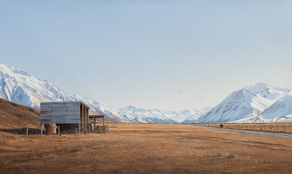 The Ahuriri Valley, just north of The Lindis Pass is one of NZ's iconic valley landscapes. A high-country sheep station rubs shoulders with the rolling tussock-lands, wetlands and towering mountains of the Ahuriri Conservation area. The mountainous landscape provided a stunning visual backdrop for this travelling artist in search of a painting.